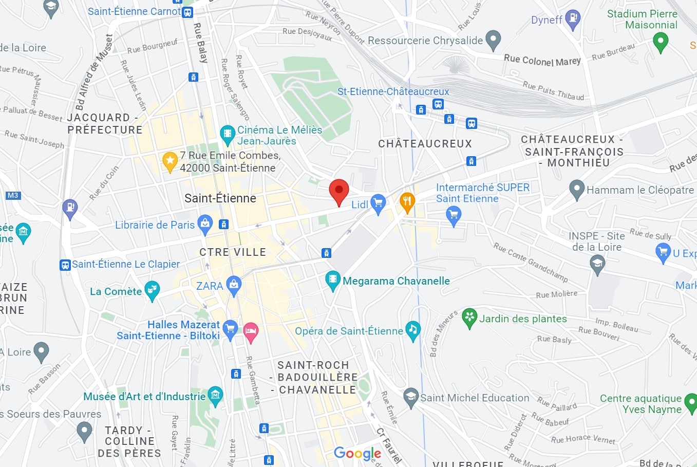 Located in the city center, between the town hall square and the Fourneyron square, close to the tramway, the Châteaucreux train station and the shops (Lidl, pharmacy etc.)